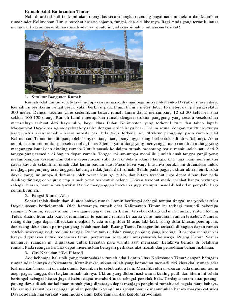 Penjelasan tentang rumah adat kalimantan timur beserta ciri khas dan keunikannya rumah adat kalimantan timur keunikan. Rumah adat kalimantan timur dinamakan rumah lamin.